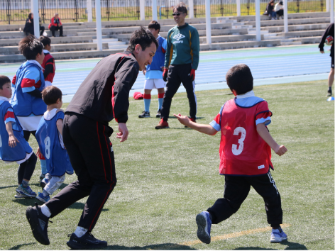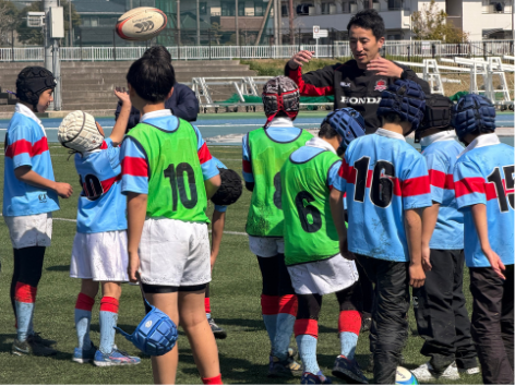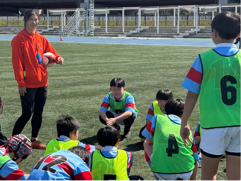 子どもたちが思いきり楽しめるよう、ゲーム形式の練習や、ラグビーを安全に楽しむために欠かせない「けがをしないための体の使い方」なども、オリンピアンが分かりやすくレクチャーいただきました。オリンピアンとの交流を通じて、ラグビーの魅力と“体を動かす楽しさ”を存分に感じてもらえた教室となりました。