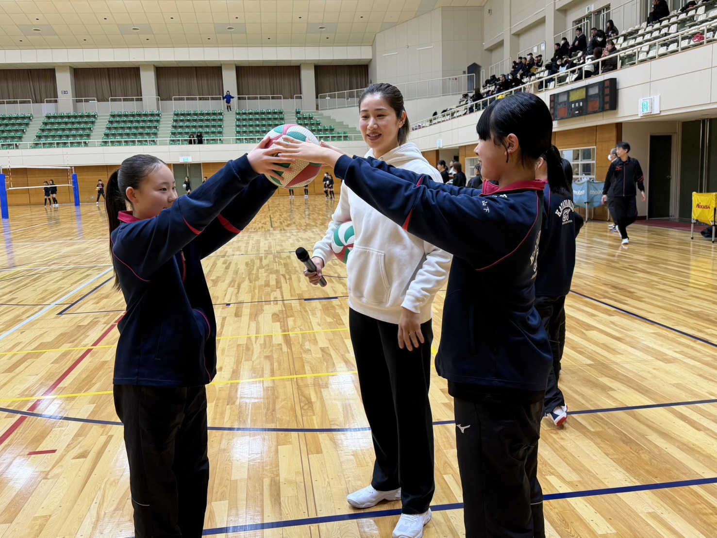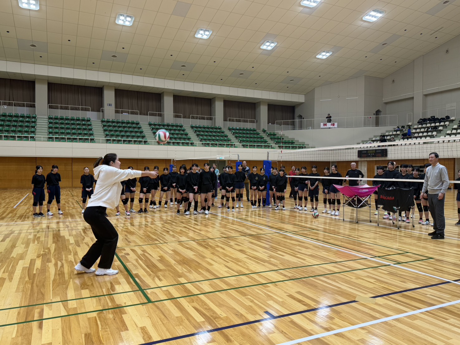 当日は、加賀市のバレーボール部(小学校〜中学生)約80名の子どもたちが参加し、基本的な身体の使い方から、パス・レシーブ・アタックのポイントをじっくりと教わりました。